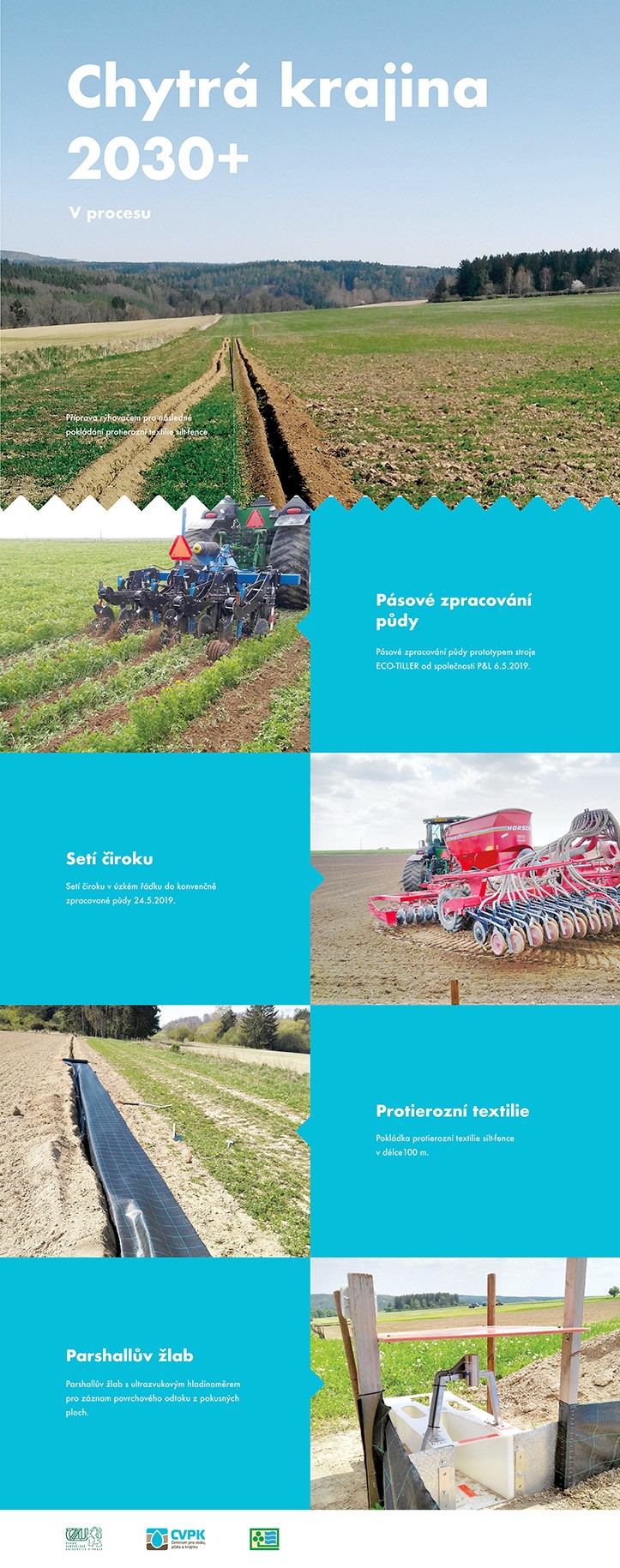 Mezi nejnovější kroky patří vytvoření tří pokusných parcel, na kterých se bude ověřovat protierozní účinnost a schopnost infiltrace povrchové vody při pěstování čiroku. „Ve spodní části pokusných ploch jsme instalovali protierozní zábranu, která slouží k usměrnění povrchového odtoku k tzv. Parshallovu žlabu, který měří průtok vody,“ vysvětlil Zbyněk Kulhavý z Výzkumného ústavu meliorací a ochrany půdy, který na projektu spolupracuje.